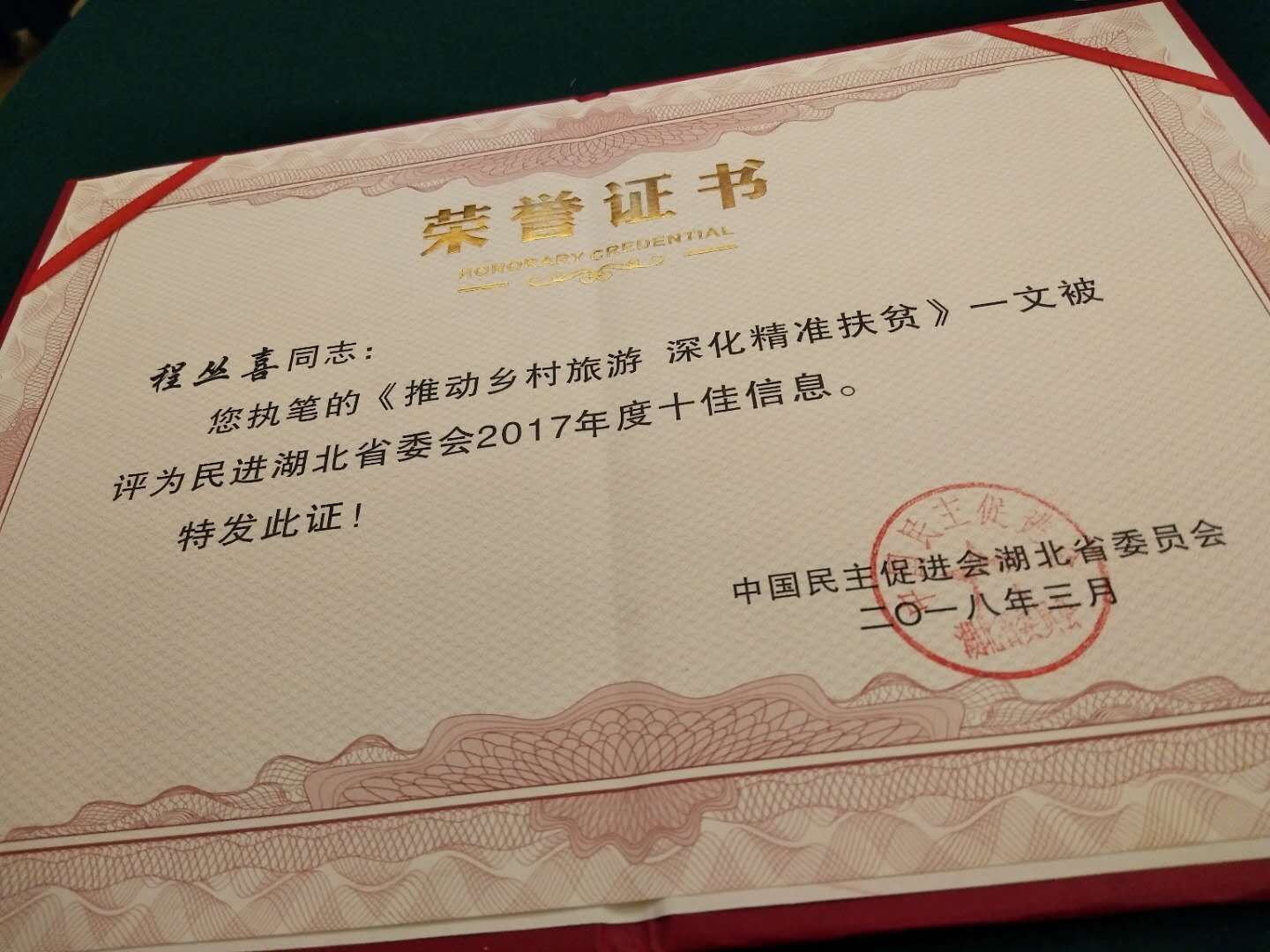 近日,从中国民主促进会湖北省委会七届二次全委会传来喜讯,我院旅游系程丛喜教授在民进湖北省委会2017年组织开展的坚持和发展中国特色社会主义学习实践活动中被评为先进个人,其执笔的《推动乡村旅游 深化精准扶贫》一文被评为民进湖北省委会2017年度十佳信息。