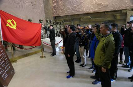 下午,一行人又驱车前往宣化中原突围纪念馆。进入纪念馆大厅首先映入眼帘的是中原军区司令部的全体指战员,正面墙上大悟山浮雕上刻着毛泽东同志写给中原军区的“生存第一,胜利第一”八个大字,充分体现了中原突围的艰难岁月。在大厅全体教工党员面对党旗,重温入党誓词,再次感受了入党时的庄严时刻,共产党员的精神和誓言是先烈们用鲜血写下的,很多老师宣誓时眼中都隐隐泛着泪花。