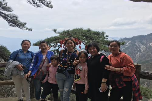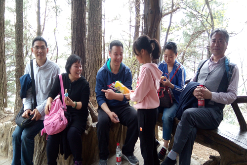 走下缆车,向山峰前进,大家相互帮扶拍照,累且快乐地交流爬山感受,经过1个多小时的努力,经过“巨蟒出山”,大家终于登顶大别山“哲人峰”,欣赏天工之妙,一览众山小。经过短暂休息,大家缓慢沿石级下山,途经“鹊桥”,远眺“摘星峰”、“仙女峰”、“云崖瀑布”,到达“小华山”,体验“玻璃栈道”,“大哥大、大姐大”惊呼叫怕声不绝于耳。兵分两路,一路沿竹林深登山步道、一路沿小华山观光电梯经猴山,坐景区交通车到天堂寨门楼集合。大家纷纷感慨风景优美、大自然的杰作,爬山和下山过程中,相互帮扶照应,分享食物和水,其乐融融。