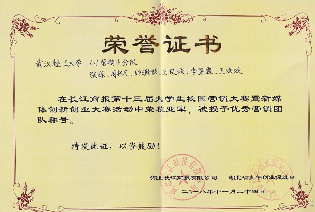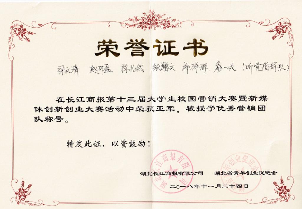 11月 24日下午,由长江商报承办的第十三届大学生营销大赛暨新媒体创新创业大赛于长江职业学院学术报告厅圆满落幕。来自我院的四支队伍一路披荆斩棘,从十五支营销队伍中脱颖而出,最终,由张练、周书凡、李姿霖、王欢欢、王琰琰、帅瀚钦组成的“101营销小分队”和梁文清、赵可盈、陈怡然,张馨文、郑祥辉、詹一夫、何明强组成的“听党指挥队”荣获亚军、“中国梦之队”和“4+2队”荣获优胜奖。我院17级辅导员罗俊获最佳指导老师奖,院分团委学生会就业部部长何明强获最佳组织者奖,我校被授予“大学生先进单位”荣誉称号。