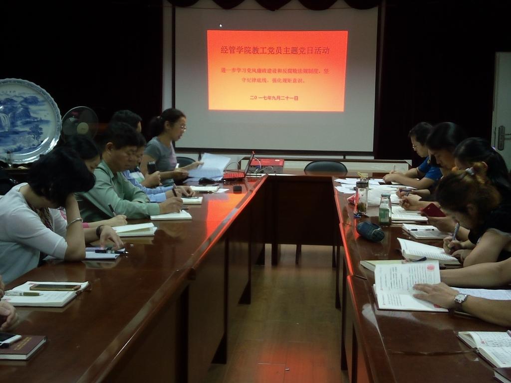 9月21日,经管学院全院教工党员集中与分散相结合开展了“进一步学习党风廉政建设和反腐败法规制度、坚守纪律底线、强化规矩意识”的主题党日活动,全体党员在副院长杜为公带领下,高举右手,面对党旗,庄严宣誓,重温自己对党忠诚的誓言,表达了为党和学校教育事业奋斗终身的决心。