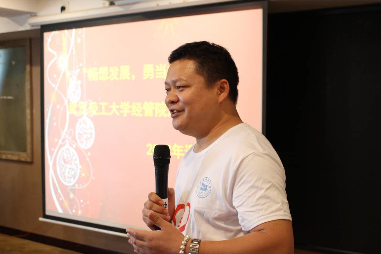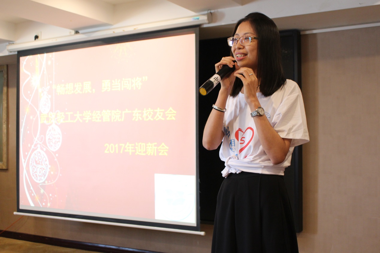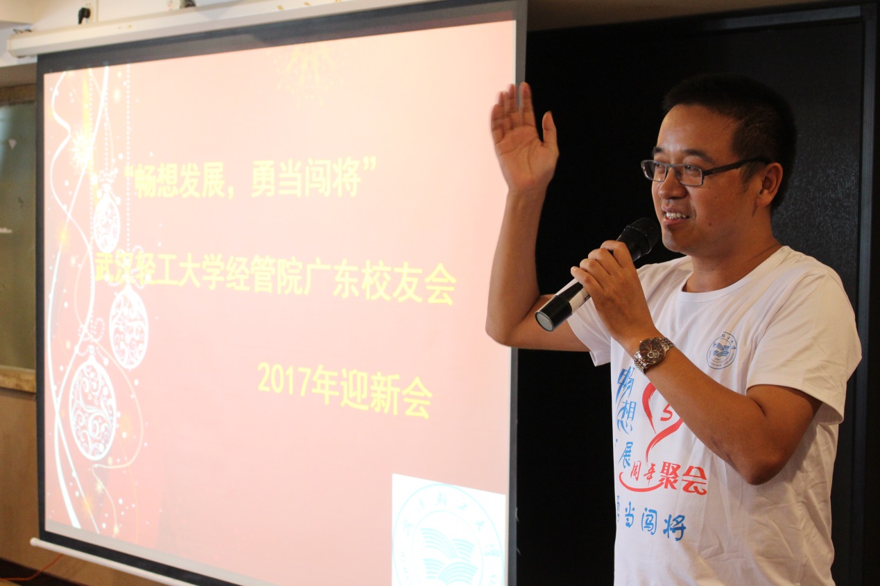 会议伊始,武汉轻工大学经管学院党委书记刘红红向各位校友介绍了学校近几年的发展情况以及经管学院校友会的概况,对各位校友对母校的贡献表示感谢。随后,广东校友会会长深圳久理达有限公司负责人易新国分享了自己的职场经历和感悟,通过给领导倒水的小细节深入浅出地告诫新入职场的毕业生们细节的重要性,各位新旧校友依次上台进行自我介绍和经历分享。