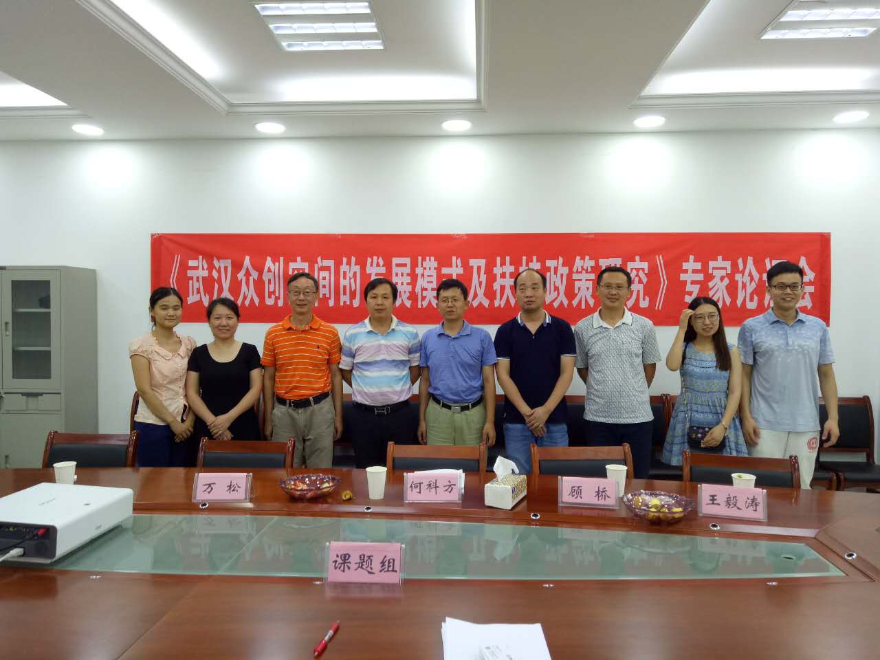 本次论证会的主要议程为四项。首先,龙教授作为主持人向大家介绍参会的各方人员,并由大家推举何科方总经理为专家组组长主持接下来的论证会。接着,何总宣布了论证会的主要任务及论证规划,决定由课题组各成员先行汇报研究成果。会议第三项,龙教授首先从武汉市现状、国内外典型做法及借鉴意义、武汉市发展模式及政策建议几方面对“众创空间”的课题研究成果做出了简要介绍。其次,课题组其他成员吴素春老师、许汝俊、刘青、孔小妹分别针对自己研究的部分、调研过程中的困惑和挑战以及深入研究后产生的思考等进行了更为深入的交流。