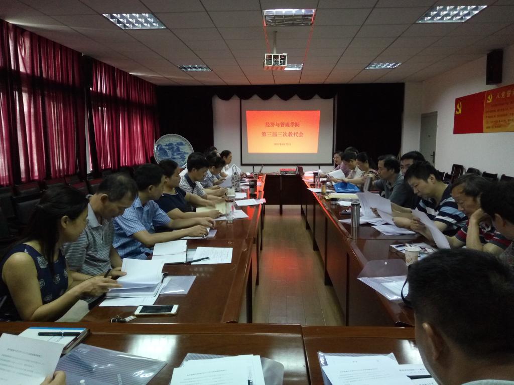 6月22日上午,经管学院三届三次教代会于文管楼519会议室召开,讨论、审议内涵建设项目立项和撤项管理、科研奖励、内涵建设(教学、科研)评估、硕士生导师组的管理与考核等方面的相关办法。