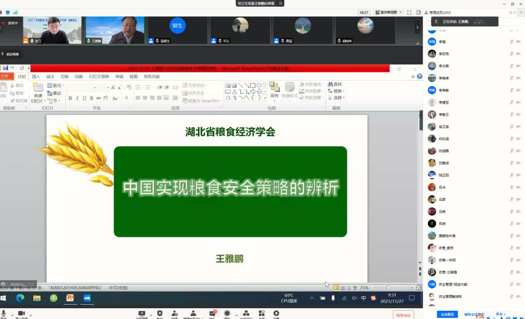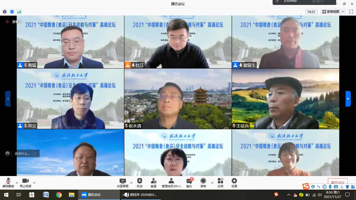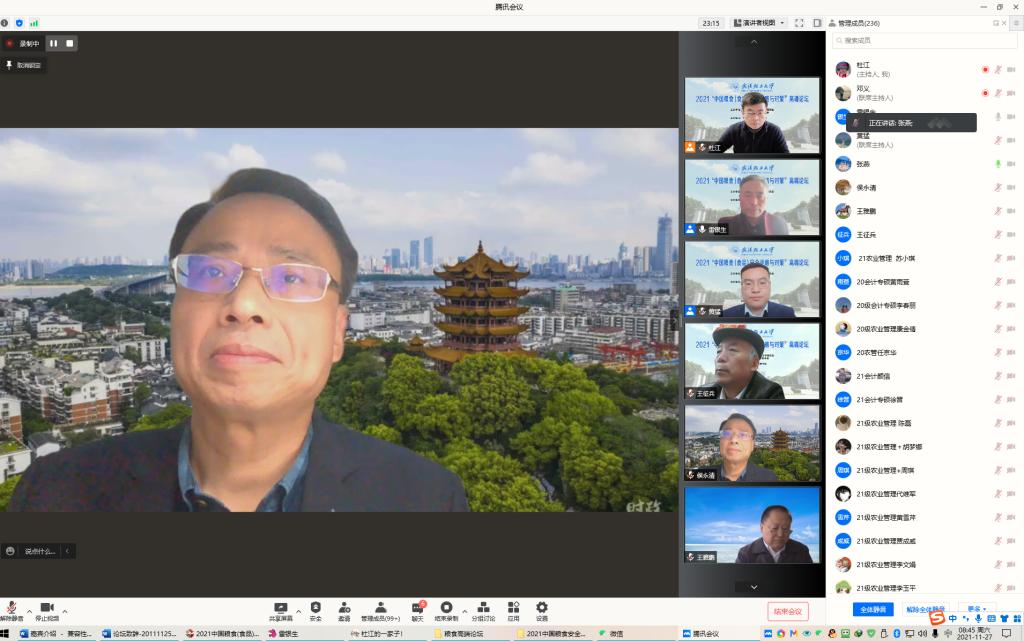 2021“中国粮食(食品)安全战略与对策”高端论坛于2021年11月27日线上举行。此次论坛由湖北省法学会农业法学研究会和湖北省食品安全研究中心联合主办,我校beat365体育官网平台承办。本次论坛邀请了湖北省法学会农业法学研究会的副会长兼秘书长、华中农业大学农业农村法治创新研究中心主任张燕教授,华中农业大学文法学院刘旭霞教授,华中农业大学经管学院博士生导师、王雅鹏教授,西北农林科技大学经管学院博士生导师、王征兵教授。论坛开幕式由beat365体育官网平台院长雷银生教授主持,院长助理杜江教授主持了主题报告、专题讨论和闭幕式。beat365体育官网平台副院长黄猛副教授、入选论文的师生代表以及校相关专业的师生共260余人参加了本次在线论坛。
