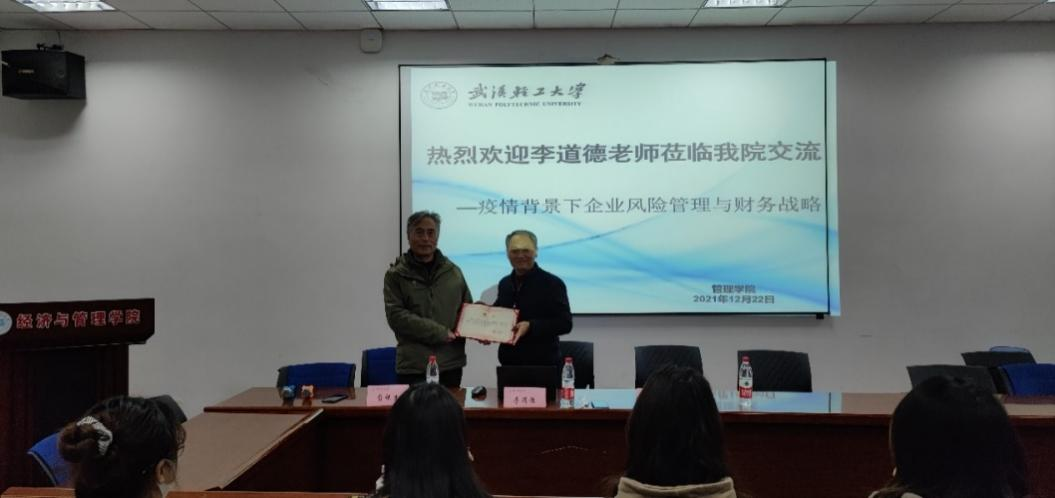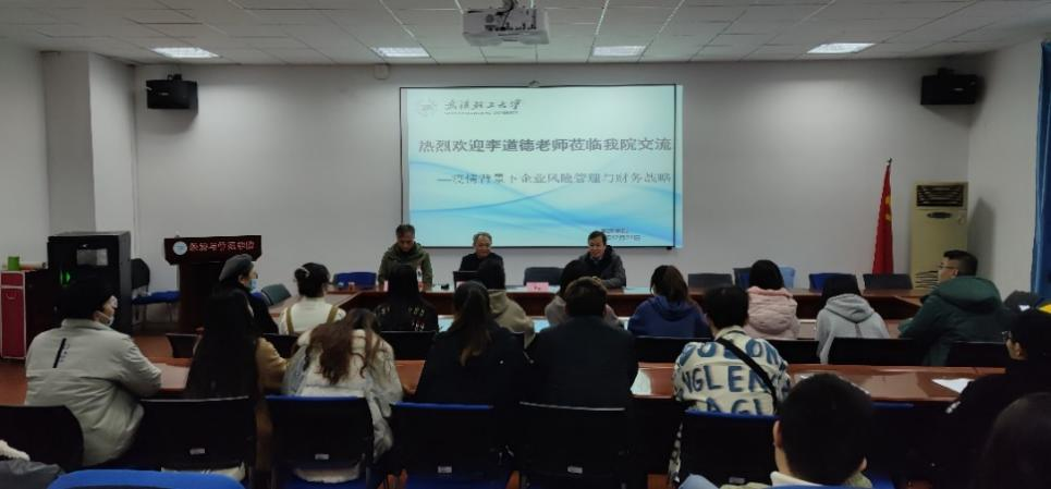 2021年12月22日,beat365体育官网平台邀请MPAcc校外研导李道德老师在金银湖校区文管楼421会议室举行了主题为“疫情背景下企业风险管理与财务战略”的交流会,beat365体育官网平台师生参与了此次交流。