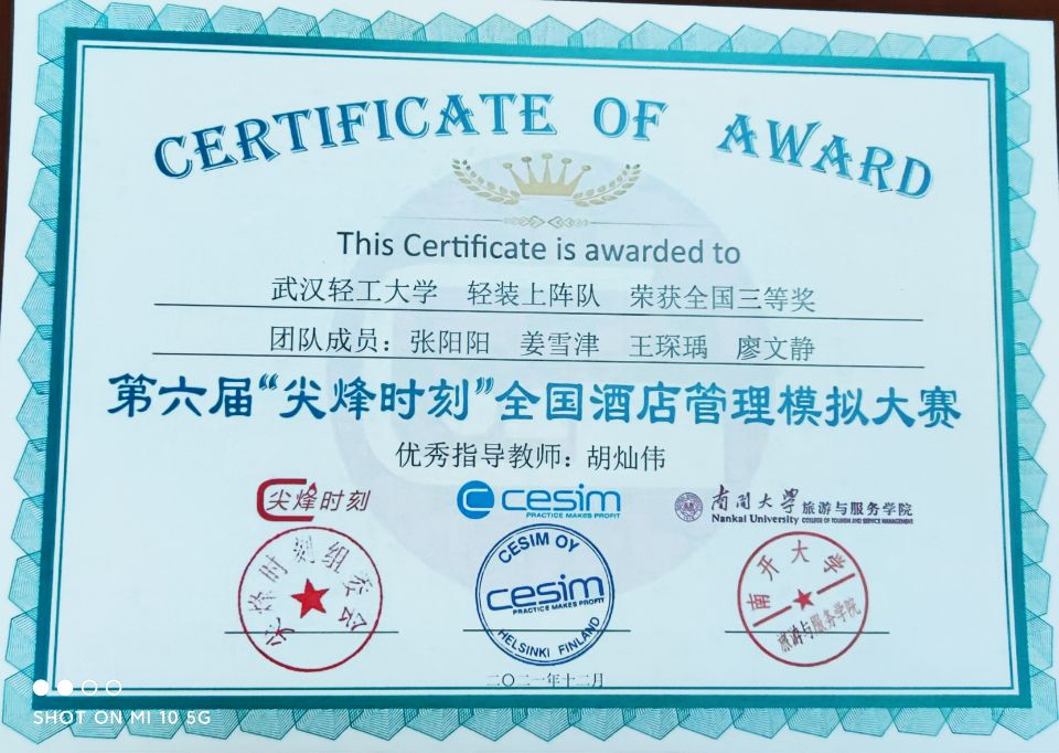 在刚刚结束的由南开大学主办,南开大学旅游实验教学中心和芬兰CESIM(中国)公司承办的第六届“尖烽时刻”酒店管理模拟大赛中,beat365体育官网平台20级研究生“轻装上阵”团队,在胡灿伟老师的指导下,取得了全国三等奖的好成绩。