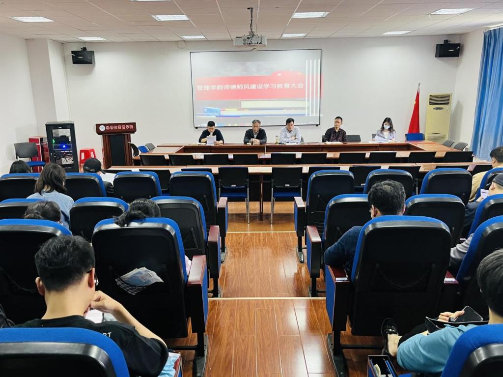 房桂兵领学了《高等学校教师职业道德规范》、《教育部关于建立健全高校师德建设长效机制的意见》和《新时代高校教师职业行为十项准则》。他强调高校教师应落实立德树人根本任务,弘扬新时代高校教师道德风尚,为人师表,率先垂范,需进一步增强自身的责任感、使命感与荣誉感。